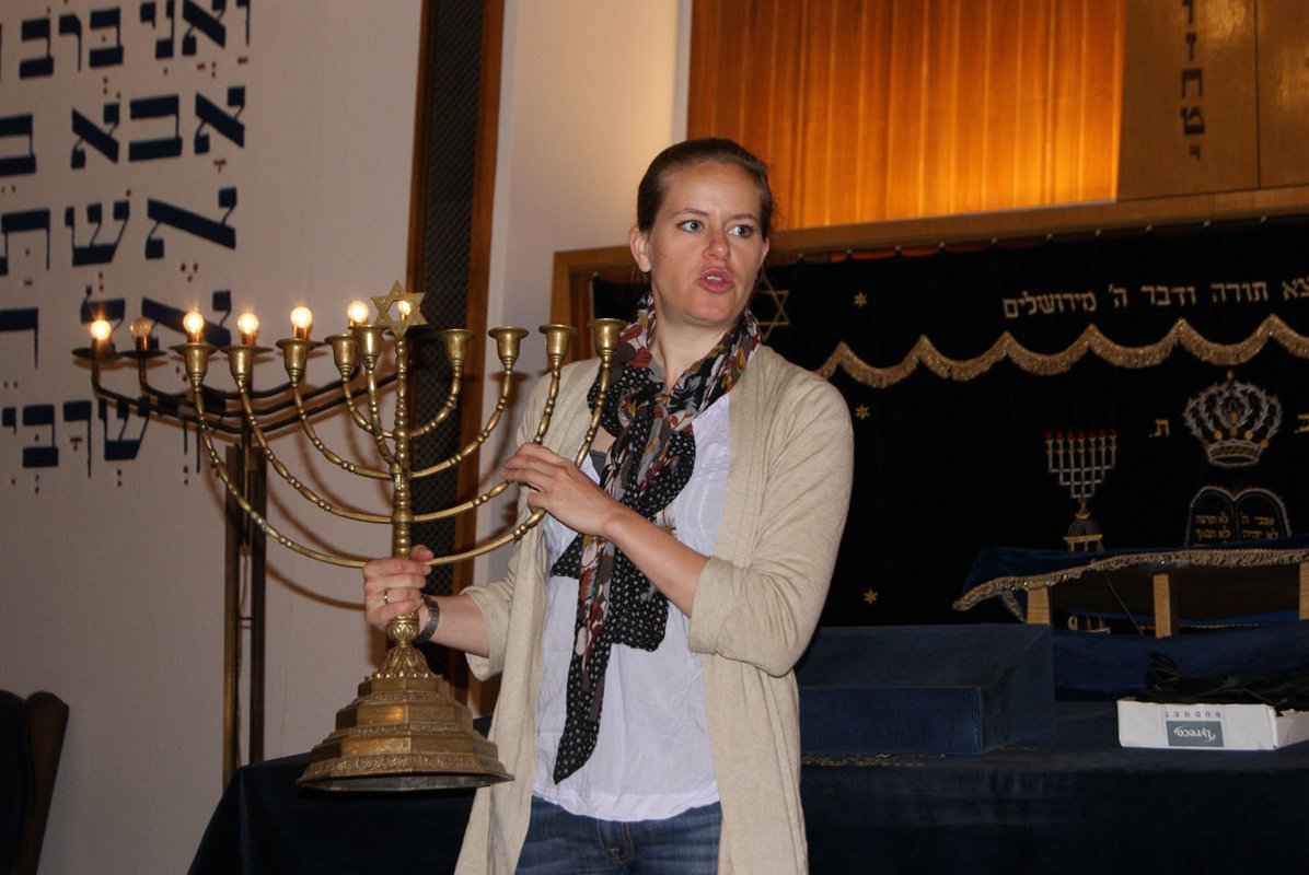 Das Foto zeigt Rosa Rappoport, die Leiterin der Religionsschule des Landesverbandes der Jüdischen Gemeinden von Westfalen-Lippe, bei der Erklärung eines Chanukka-Leuchters in der Dortmunder Synagoge.